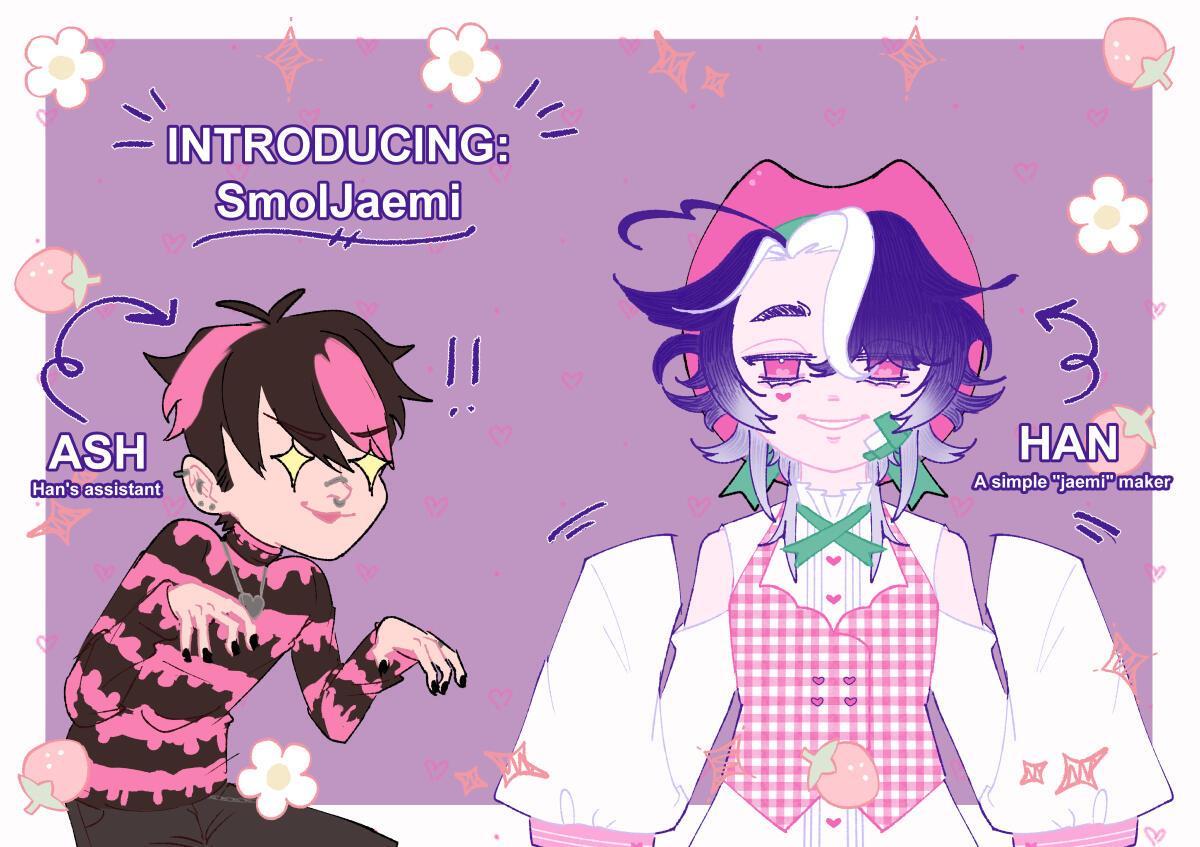 SmolJaemi consists of a vtuber duo, Han and Ash. Han, a "jaemi" maker and their assistant, Ash, that suddenly appeared one day.What is "jaemi" you ask? Well, it's strawberry jam filled with lots of fun and an additional secret ingredient (It’s love ♡)! Whenever we need more ‘fun’ to put into the jam, we play a variety of games. Han is a horror game enthusiast (despite being the biggest weenie out there), so expect quite a few games in this genre from us. Ash is a watch-people-play-games enthusiast and is usually back-seating during stream.We hope you enjoy the stay!